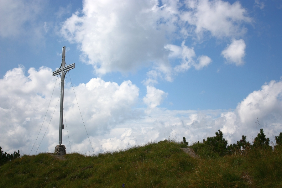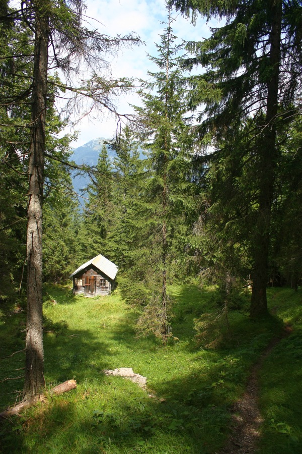 Diesem Fahrweg folgt man für eine Weile auf einer Seehöhe von ca. 1100 Metern. An dessen Ende zieht ein ziemlich steiler Steig unter haushohen Felswänden hinauf und eine Lücke nutzend zur Hochegghütte. Kurz hinter dem kleinen Hüttengebäude verzweigt sich der Weg. Zum direkten Anstieg in die Scharte habe ich schon