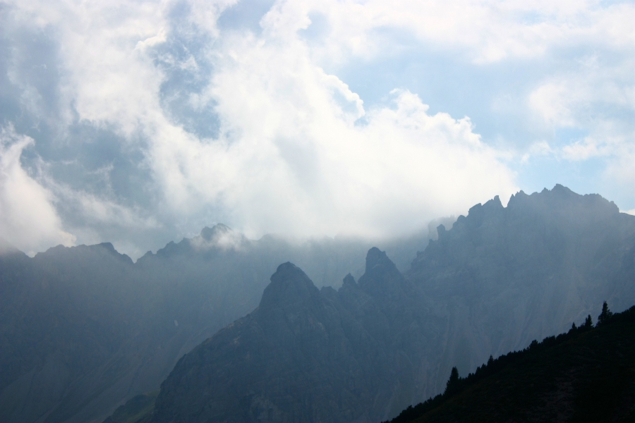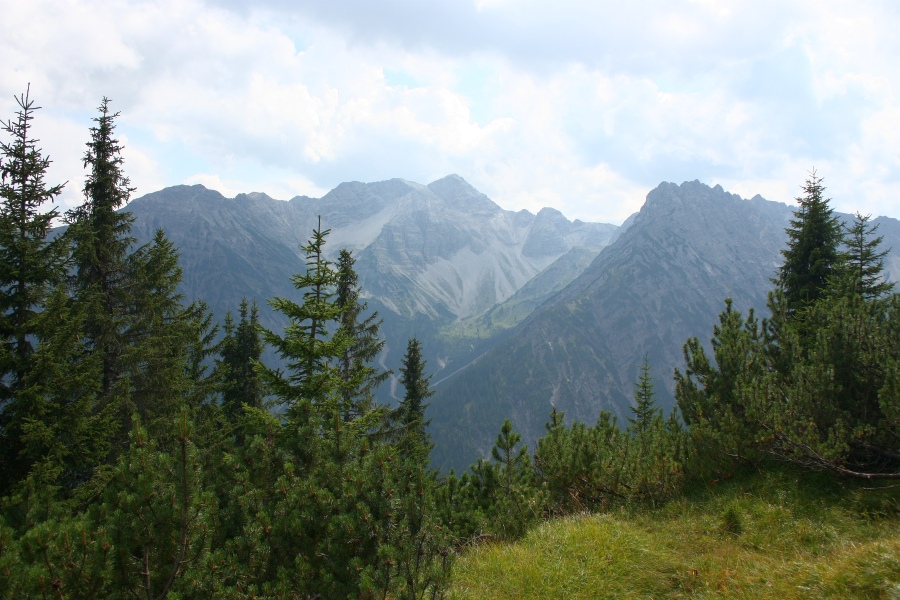 Von der einstmaligen Galtalpe ist leider nicht mehr viel übrig, vermutlich wurde sie auf Grund des fehlenden Wassers aufgegeben. Der schöne Almboden verwächst zusehends, an dessen oberen Rand führt der Steig durch eine Waldschneise weiter unterhalb des Hallanderberges hinein. Es beginnt eine Latschengasse, welche lediglich langsam an Höhe gewinnend weit über dem Liegfeistbach in Richtung Scharte aufsteigt. Dort angekommen eröffnet sich der herrliche Ausblick zu beiden Seiten des Kammes auf die Tannheimer Berge, die Leilachspitze und die Gipfel der Liegfeistgruppe.