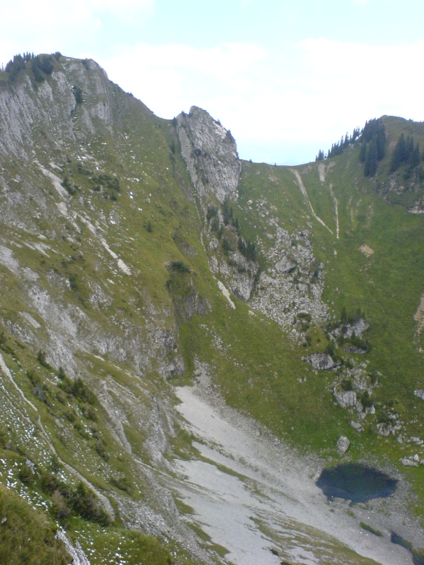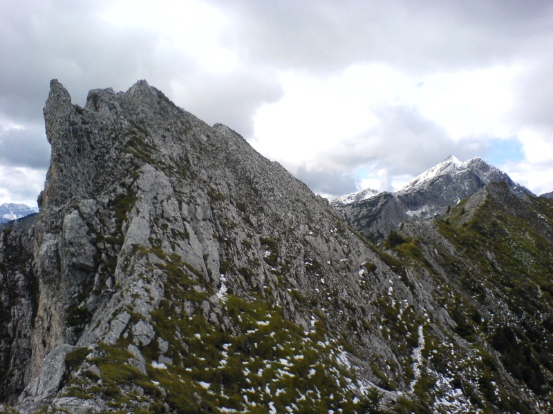 Wer den Anstieg zum Hasentalkopf angehen möchte, sollte über Schwindelfreiheit und Trittsicherheit verfügen. Tatsächlich geht es nämlich stellenweise etwas luftig her. Nach wenigen Minuten am kleinen Gipfel angekommen, heißt es ersteinmal die herrliche Rundsicht genießen. Sehr auffällig ist der beinahe kreisrunde Kessel, welcher sich zu Füssen des Hasentalkopfes und der Vorderen Scheinbergspitze absenkt. Mutmaßlich dürfte es sich hier um eine riesige Doline handeln.