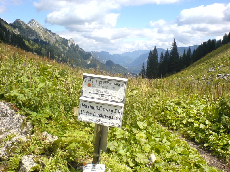 Nach ausgiebiger Rast über den Grat wieder zurück zum Scheinbergjoch und dann nach Norden in die Kesselflanke absteigend geht es im weiten Bogen in den gegenüberliegenden Sattel. Abermals ist ein kurzer Anstieg zu bewältigen und in einer langgezogenen Linkskehre geht es in die steile Flanke in Richtung Kesselwand. In kurzen Kehren steil hinunter durch mannshohes Strauch- und Buschwerk, hinab zum Bäckenalmsattel. Nach links würde man zur nahen Kenzenhütte gelangen (Shuttle-Bus nach Halblech). Nach rechts geht es durch das fast vier Kilometer lange Sägerbachtal hinaus zum großen Parkplatz am Taleingang.