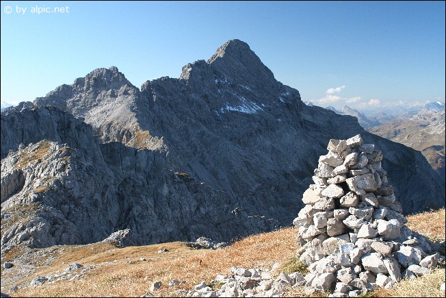 Biberkopf und Hochrappenkopf. Auf der gegenüberliegenden Seite (Winterniß) stets nahe am Kamm bleibend in einem von Nord nach Ost übergehenden Bogen über die mit Schrofenbändern durchzogene Hochfläche leicht ansteigend zum Gipfel.