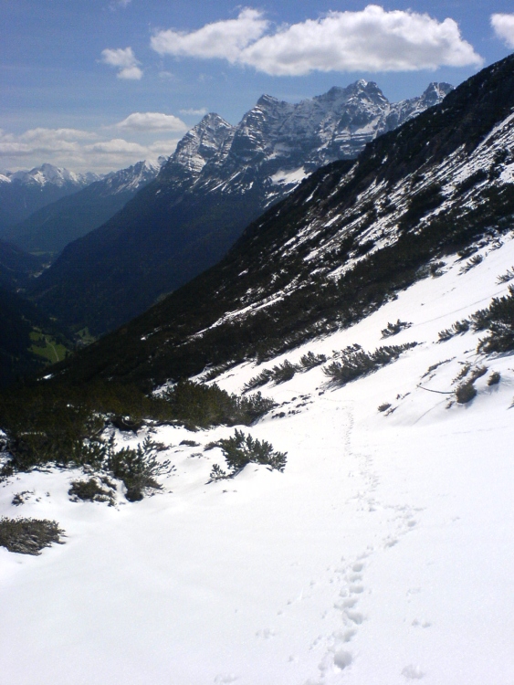 Ringsum an den weißen Hängen sieht und hört man immer wieder kleine Schneebretter abrutschen und mit eindrucksvollem Tosen über die Felsstufen hinabstürzen. Mein Plan B wäre gewesen, über den Steilhang unterhalb der Jochspitze ins Jochbachtal abzusteigen, leider kann ich aber von meinem aktuellen Standplatz den Verlauf dieser Route nicht einsehen und der Hang erscheint mir in Anbetracht der Gefahr von einem Schneebrett mitgerissen zu werden, als zu riskant. Es geht also nach einer ausgiebigen Rast den Aufstiegsweg wieder hinunter.