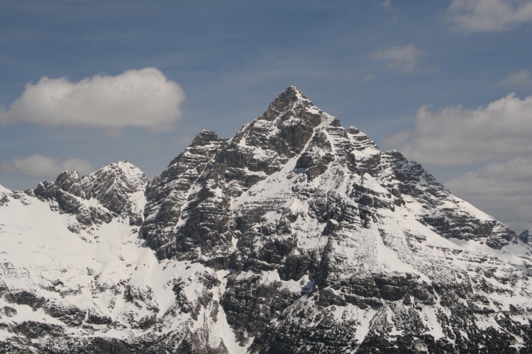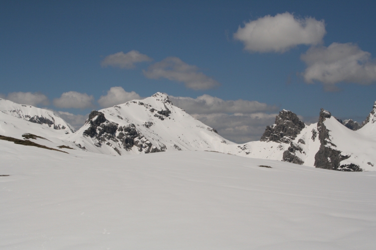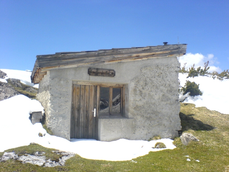 Kurz vor der höchsten Erhebung des Kanzberges steht die Kanzberghütte (eine Hirten- und Notunterkunft) in einer Mulde geschützt mit ihrem gedrungenen Bau. Bei der Besichtigung der Unterkunft fällt mir auf, dass sogar ein kleiner Ofen in der Hütte steht. Am Steinmandl, welches hier als Gipfelmarkierung dient, lasse ich erst einmal die umliegende Bergwelt auf mich wirken. Selten habe ich eine so eindrucksvolle Felskullise gesehen, wie hier inmitten der Hornbachkette und flankiert von Hochvogel, Großer und Kleiner Wilder und die Höllhörner direkt am Hornbachjoch. Mein eigentliches Gipfelziel, die Jochspitze, lasse ich für heute sausen. Die Schneemassen sind mir einfach zu viel und das Waten über den Rücken hin zur Jochspitze würde sicher noch ewig dauern.