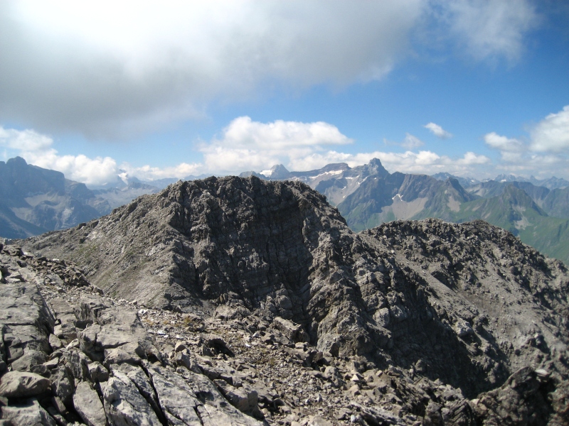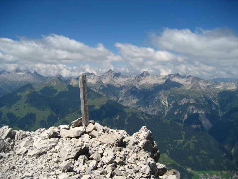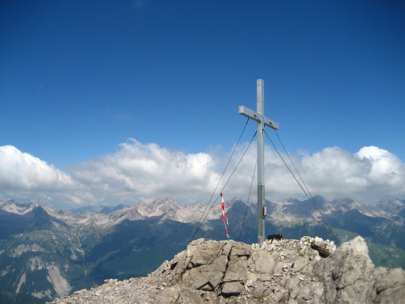 Am Gratrücken entlang zum nun schon sichtbaren Kreuz, geht es zunächst über Gras und später durch schrofiges und schuttreiches Gelände ohne jede Schwierigkeit zum Westgipfel (2580m) hinauf. Wer auf Kletterei im II. Schwierigkeitsgrad, viel Schutt und teils unsicheres Gestein verzichten möchte, lässt es dabei bewenden und genießt die attraktive Gipfelrundsicht die sich von hier heroben absolut sehen lassen kann.