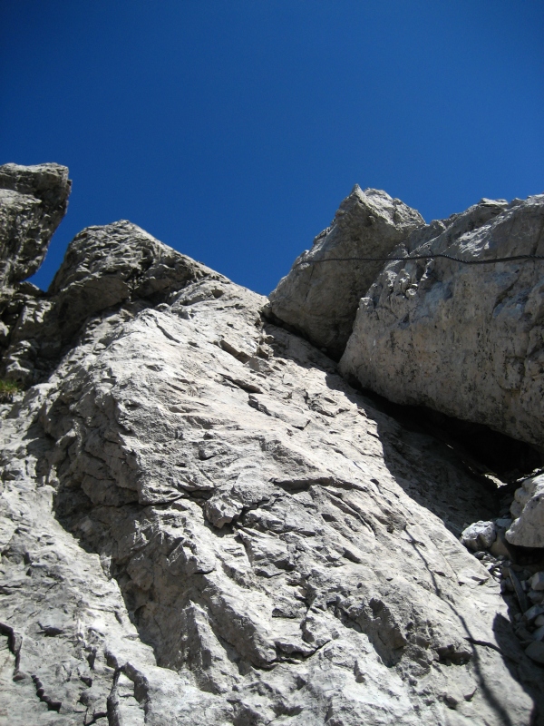 Eifrige werden es sich aber nicht nehmen lassen, auch den Kreuzgipfel zu besuchen. Dazu folgt man dem Gipfelkamm noch ein paar Meter, bis eine Markierung nach links in die Flanke weist. Über Schutt und ein paar Schrofen über den Rücken hinunter bis man, schon fast in der Einschartung angelangt, auf die erste Kletterei trifft. Eine etwa mannshohe Stufe wird dabei über recht unsicheres Gestein abgeklettert. Der Zapfen in der Doppelscharte wird südlich umklettert und man gelangt an den Grataufbau welcher zum Kreuzgipfel emporführt.