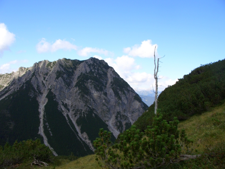 Bei längerer Trockenheit dürfte das eine etwas haarige Angelegenheit sein, wenn der Boden hart ist und man keine sauberen Tritte schlagen kann. Da aber in letzter Zeit doch einige Regenfälle für einen weicheren Untergrund gesorgt hatten, war es auch kein allzu großes Problem dort hinüber zu kommen. Man muss halt konzentriert sein! An der Kante angelangt wird es wieder einfacher und vorbei an ein paar Felstürmen führt der Pfad steil durch eine ausgeholzte Latschengasse in Richtung Sattele hinab. Tatsächlich war ich nur einige Meter von der richtigen Latschengasse bei meinen ersten Aufstiegsversuchen gescheitert. Vom Sattele aus gesehen kommt die richtige Gasse rechts herunter und ich versuchte mein Glück knapp links des Sattele.