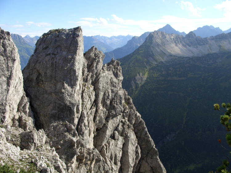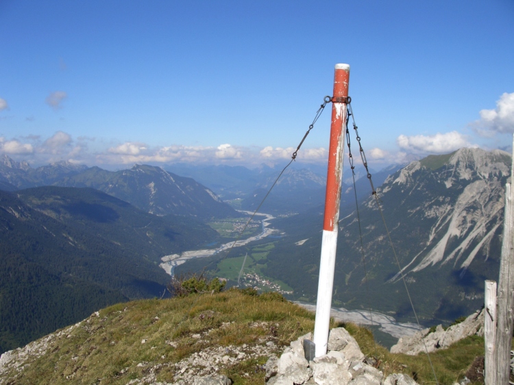 Vorerst machte ich mich daran über den Grat hinüber zum Gipfel der Saldeinerspitze zu gelangen. Über teils brüchiges Geschröf und dann wieder einem ganz kleinen Steiglein geht es in ein paar Minuten zu dem Markierungsrohr. Daneben steht ein etwas mickriger Zaunpfahl, der vielleicht einmal als Gipfelkreuz-Ersatz gedient haben mag. Allerdings ein wirklich dürftiges Kreuz, falls dem tatsächlich so sein sollte. Nordwestlich ist das Schwarzwassertal in seiner gesamten Länge einsehbar und ich kann auch das Dach der Eibleshütte erkennen.