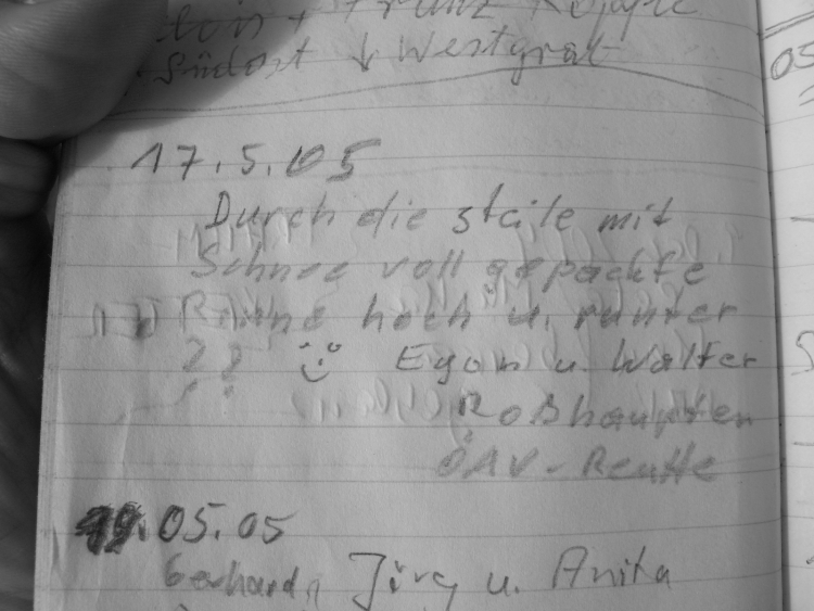 Beim Stöbern im Gipfelbuch stelle ich fest, dass ich der 10. Besucher dies Jahr bin. Einen Eintrag von Egon aus dem Jahr 2005 kann ich auch entdecken und scheinbar hat er die selbe Aufstiegsroute wie ich gewählt, ebenfalls die steile Schuttrinne. Nun aber wieder weiter, da es schon spät ist. Bin ich doch erst um etwa 13 Uhr von Vorderhornbach los und die Versuche einen Weg über den Westgrat der Saldeinerspitze zu finden hatten ebenfalls eine Menge Zeit gekostet, es war mittlerweile schon nach 18 Uhr.