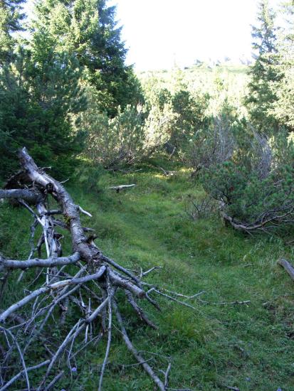 Von dem kleinen Tal aus führt bald eine halbwegs ausgeprägte Spur nach rechts den Hang hinauf und schon ist man wieder auf dem markierten Steig, welcher durch zwei kleine Tälchen zu der Wegverzweigung führt und im weiteren Verlauf zurück hinunter nach Vorderhornbach.