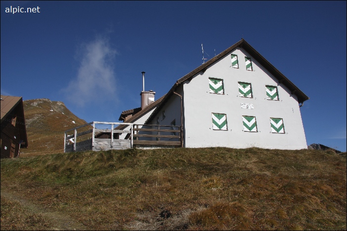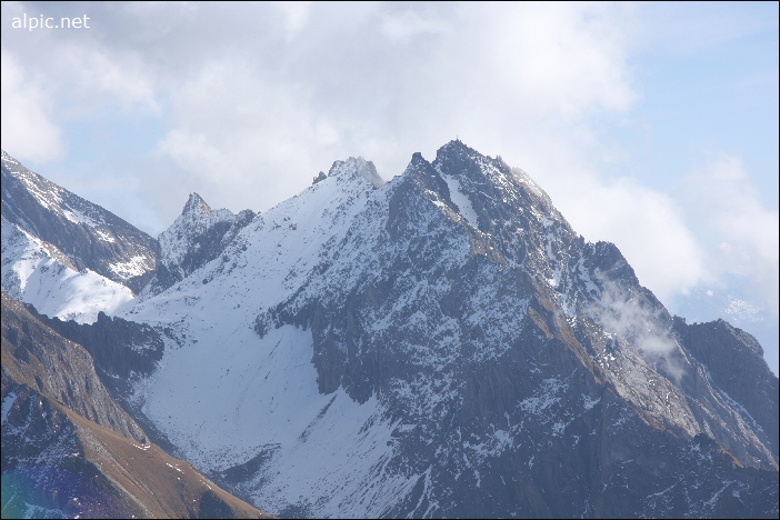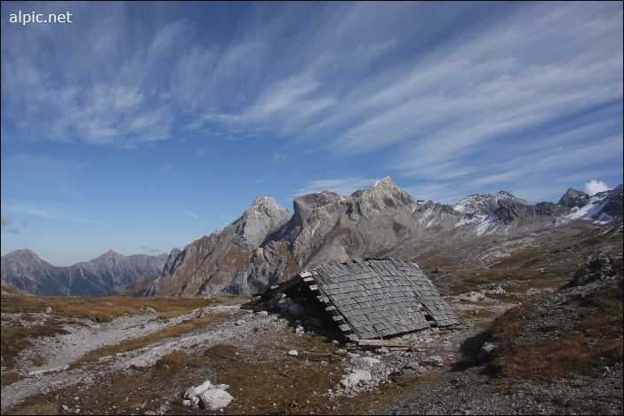 Ein grandioses Bergpanorama ist zu bestaunen: Eisenspitze, Parseierspitze, Hornbachkette, Freispitze, Lechtaler Wetterspitze, Vorderseespitze, Hoher Riffler, uvm. Nach der Brotzeit im Sonnenschein folgt der Abstieg über den Nordwestgrat, welcher mit einer kleineren Klettereinlage aufwartet. Diese ist bei sommerlichen Verhältnissen sicher kein Problem, bei Schnee und Vereisung, so wie in meinem Fall, tut man aber gut daran Vorsicht walten zu lassen, da es etwas luftig um eine Kante zur Fortsetzung des Grates hinuntergeht. Danach über Schutthalden hinunter ins Alperschonjoch, wo eine verfallene Hütte ihr Dasein fristet und gleich als Fotomotiv herhalten muss.
