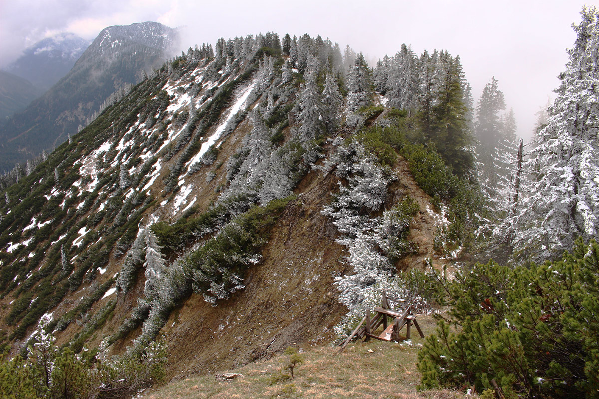 Der alte Steig ist teilweise noch erkennbar, verliert sich aber immer wieder. Trotzdem kann man hier nicht fehl gehen, wenn man stets am Scheitel des Rückens gegen Osten aufsteigt. Nach etwa 200 Höhenmetern ab dem Tobel erreicht man die Sattelfläche, auf welcher in alter Zeit die Hütte am