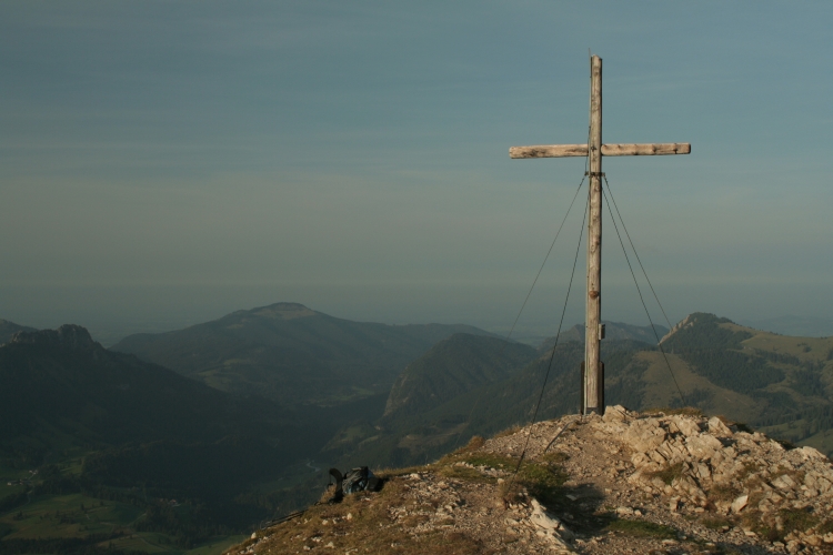 Vom Kühgundkopf geht es über den recht breiten Rücken weiter, hinunter zum Gipfelkreuz auf dem Wannenjoch. Eine herrliche Aussichtskanzel hoch über Oberjoch und Schattwald, die einen interessanten Ausblick auf die Allgäuer Vorberge wie Grünten, Reuter Wanne oder den Edelsberg inne hat. Es beginnt bereits zu dämmern und die Schatten der Berge ziehen sich schon lang durch die Täler, ein wunderbarer Herbsttag in den Bergen und das obwohl es "nur" eine abendliche Wanderung ist. Am schönsten ist die Ruhe, die man unter Tags so sicherlich nicht genießen könnte. Ich mag es um diese Uhrzeit unterwegs zu sein.