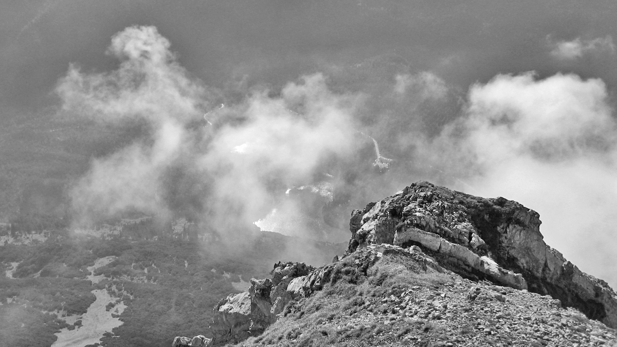 Blick vom Grubigstein hinab zum Blindsee und dem Fernpass - welche sich großteils aber hinter den Nebelfetzen verstecken
