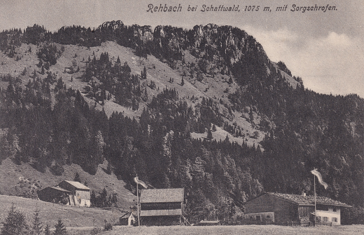 Rehbach bei Schattwald mit Sorgschrofen - Foto: Verlag J. Heimhuber (1908)