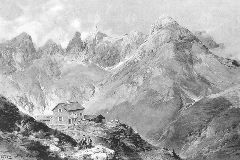 die Kemptner Hütte um 1894 - gez. von E. T. Compton (aus: Zeitschrift des deutschen und österreichischen Alpenvereins von 1894)