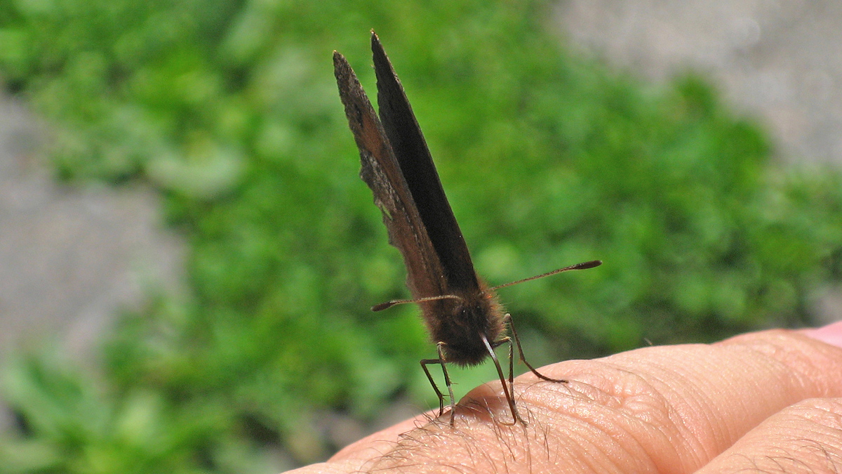 ein Gelbgefleckter Mohrenfalter (Erebia manto) auf der Suche nach Mineralien
