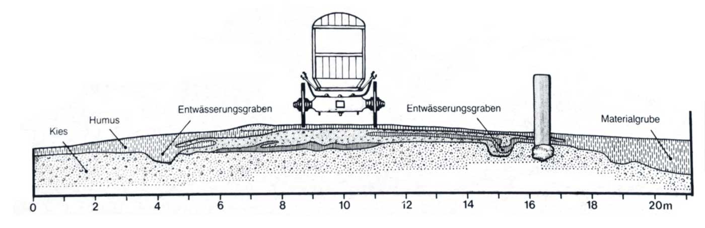 Rekonstruktionszeichnung eines Straßendamm-Querschnitts auf einer Infotafel in der Nähe von Lechbruck