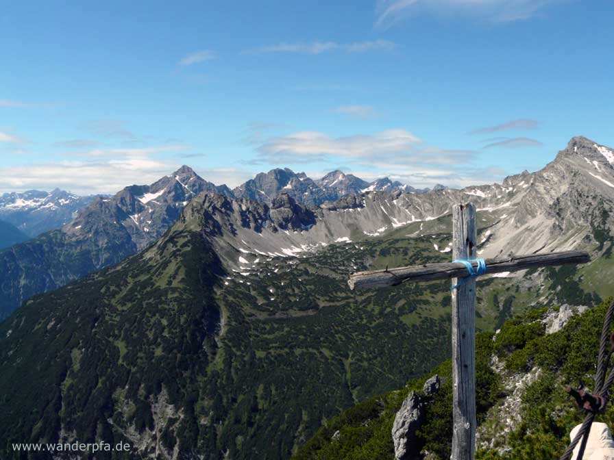 Gipfel der Saldeiner Spitze mit Blick auf die Stallkarspitze (rechts), Grubachspitze (links) und das Hornbachkar (mitte)