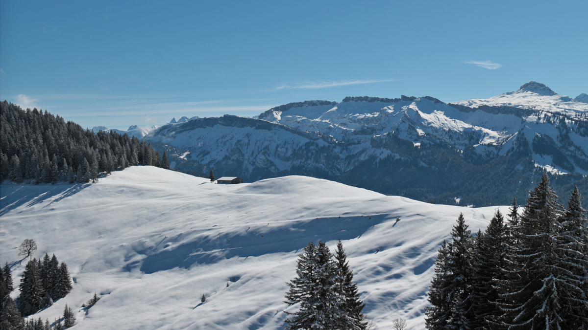 ein Aussichtsbalkon erster Güte - Blick vom Renkknie über die Hochriesalpe (der bewaldete Hochrieskopf am linken Bildrand) auf die Gottesackerwände und zum Hohen Ifen