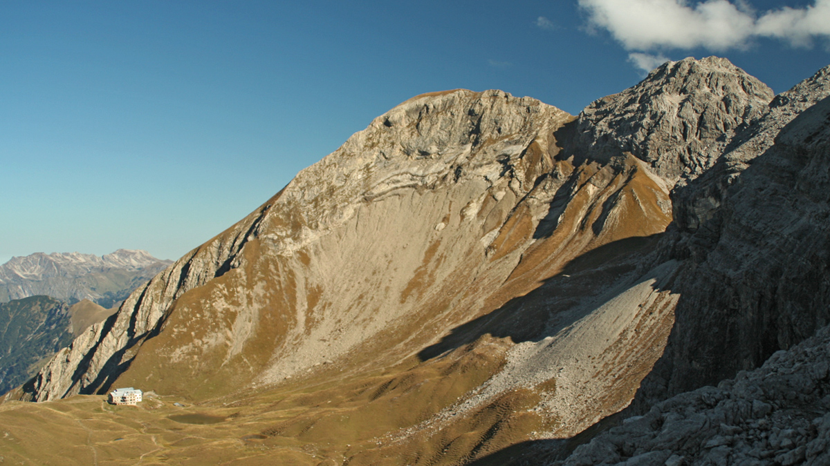 der abgerundete Linkerskopf und die Rotgundspitze ragen hoch über die Rappenseehütte auf
