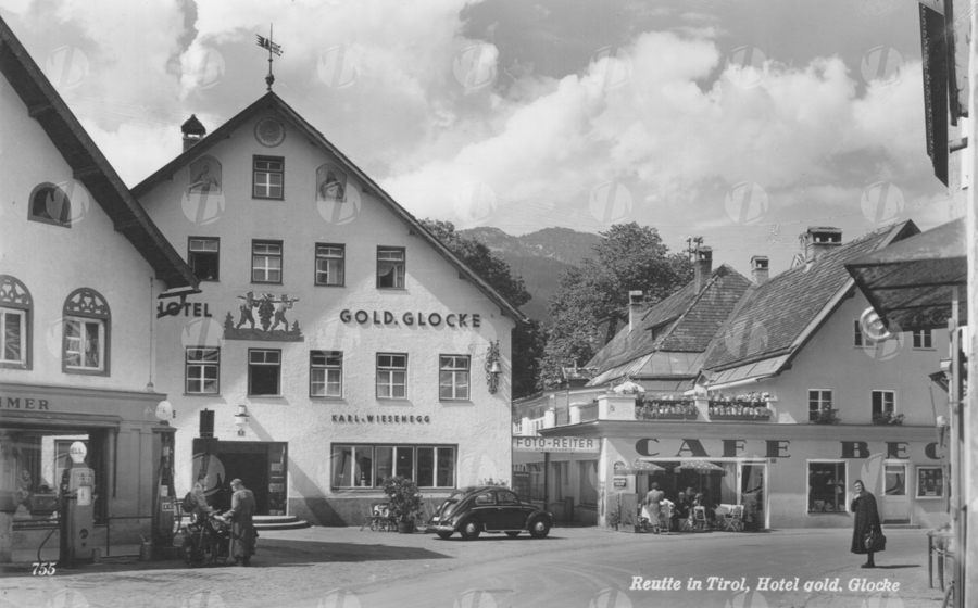 Hotel gold. Glocke - links das Kaufhaus Thummer und rechts das Cafe Beck - Foto: Tiroler Kunstverlag, Chizalli (vmtl. 1950er Jahre)