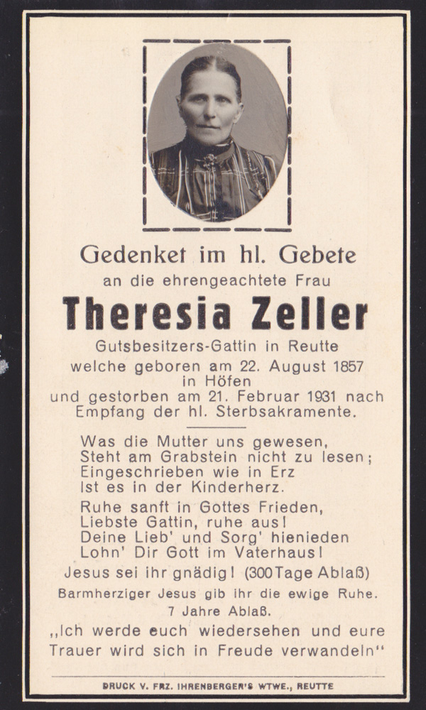 Am Montag wurde unter großer Beteiligung die im 73. Lebensjahre stehende Theresia Zeller zu Grabe getragen. Mit der Verstorbenen, die ihren Gatten und 5 erwachsene Söhne hinterläßt, ist eine gottesfürchtige, brave und treubesorgte Mutter von hinnen gegangen, deren höchstes Ziel die Erziehung ihrer Kinder und die Arbeit war.