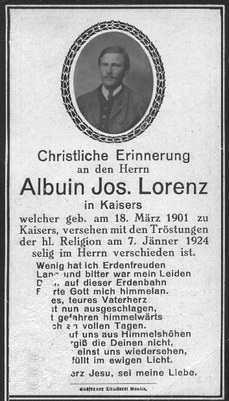 Kaisers, 12. Jan. Am 7. 1. starb hier Herr Albuin Lorenz im Alter von 23 Jahren. Er hinterläßt eine