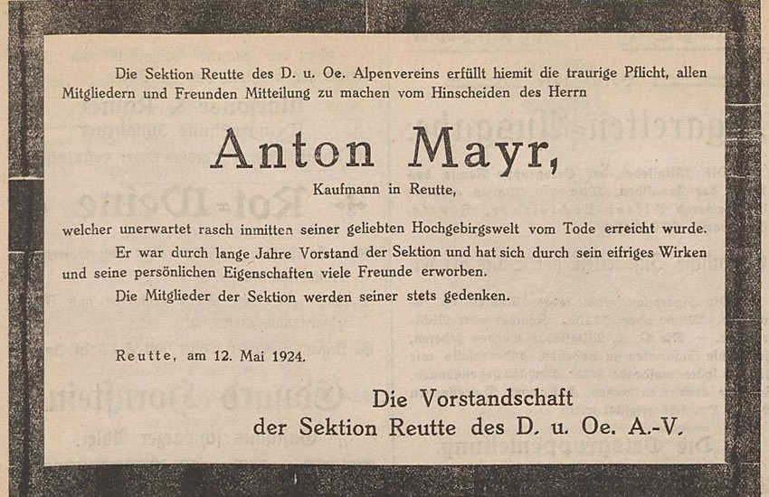 Mayr verschied in Folge eines Schlaganfalles während eines Erholungsaufenthaltes in Lechleiten beim Holzgauerhaus. Schon seit Jahren war dies sein bevorzugtes Urlaubsdomizil. Er galt als Liebhaber der Bergwelt und hatte wohl maßgeblich den Bau der
