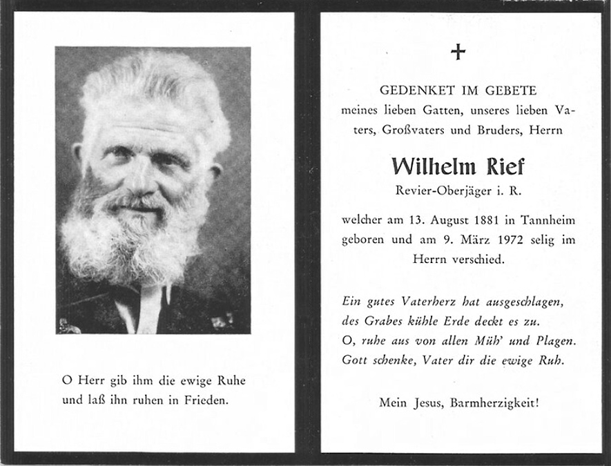 In frühester Jugend hatte der Verstorbene, wie es damals eben war, von seinem Vater Donatus Rief das Kunstgewerbe eines Stukkateurs erlernt. So mancher von ihm modellierte Hirschkopf ziert noch das eine und andere Tannheimer Haus. Auch am kulturellen Leben von Tannheim war Wilhelm Rief intensiv durch Jahrzehnte beteiligt. Viele Jahre, bis ins hohe Alter, gehörte er dem Kirchenchor und der Musikkapelle an. Auch für die Heimatkunde leistete der Verewigte nicht zu unterschätzende Beiträge. Welche Begeisterung empfand er, als ich ihm seinerzeit die Auffindung des Rueff'schen Wappenbriefes mitteilen konnte und dem Erwerb dieses Dokumentes schließlich nichts mehr im Wege stand. Dank gebührt dem Verstorbenen für die Überlassung der Aufzeichnungen seines Großvaters, des Wundarztes Schweighofer, zur weiteren Auswertung. Diese Aufzeichnungen geben vor allem Aufschluß über die wirtschaftlichen Verhältnisse im Tannheimer Tal zur damaligen Zeit. Jahrelang versah Wilhelm Rief die Stelle eines Aufsichtsoberjägers in den Tannheimer Jagdrevieren. Das letzte Halali ertönte über seinem Grab, gewidmet von seinen Berufsgenossen. Auch dem Schützenwesen hing er begeistert an. Bis ins hohe Alter kämpfte der Nestor mit Begeisterung au den Schießständen weit und breit. Dies würdigte auch Oberschützenmeister Richard Rief mit bewegten Worten am offenen Grabe. Nicht zuletzt war der Verstorbene in seiner Landwirtschaft allen Neuerungen gegenüber stets aufgeschlossen. So ist mit dem Ableben von Wilhelm Rief wieder ein Stück "Alt-Tannheim" von dieser Erde geschieden.