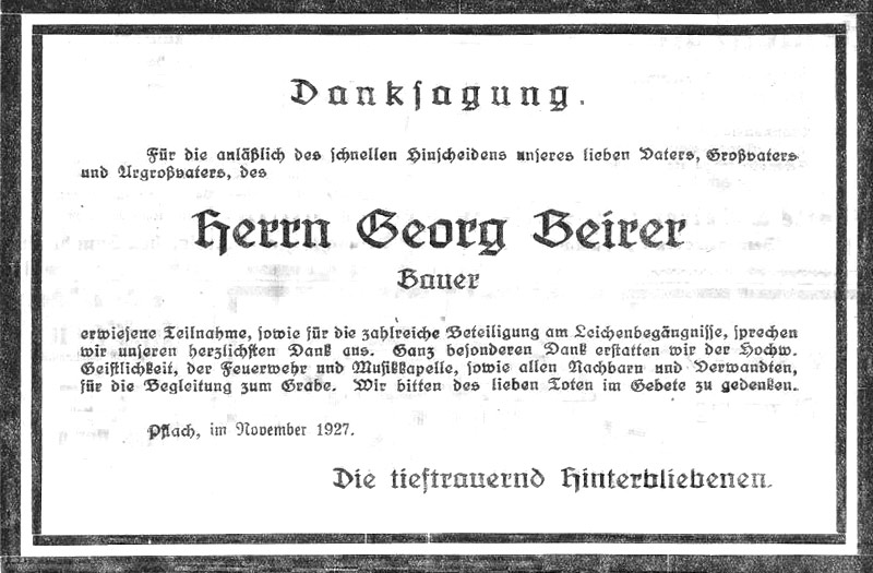Pflach. (Beerdigung). Am Donnerstag, den 3. ds. Mts., schloß sich das Grab über den im 79. Lebensjahre stehenden Bauer Georg Beirer, vulgo "Scheckles Jörgl". Mit ihm ist einer der ältesten Männer des Ortes ins Grab gestiegen. Ein arbeitsreiches Leben ist hinter ihm. Die Musik und Feuerwehr gaben ihm das letzte Geleite.