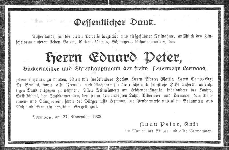 Lermoos. Schnell tritt der Tod den Menschen an. Dieses Sprichwort hat sich am vergangenen Sonntag in unserer Gemeinde wieder als wahr erwiesen. Der hiesige Bäckermeister Eduard Peter begab sich noch rüstig in der Frühe an seine Arbeit, das Brotbacken. Am gleichen Vormittag ereilte ihn plötzlich ein Schlaganfall, an dessen Folgen er wenige Minuten darauf verschied. Der Herr gebe ihm die ewige Ruhe.