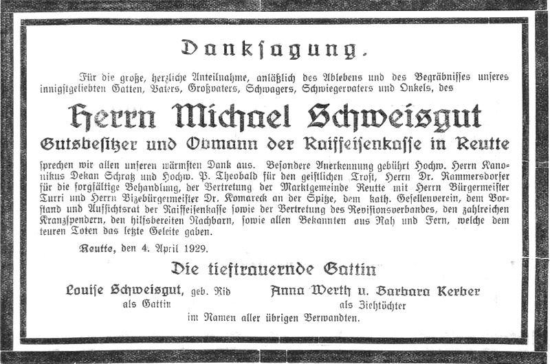 Herr Michael Schweisgut. † In der Nacht vom Ostermontag auf Dienstag starb Herr Michael Schweisgut nach kurzer Krankheit, versehen mit den heiligen Sterbsakramenten, im 68. Lebensjahre. Der Dahingeschiedene war viele Jahre hindurch Obmann der Raiffeisenkasse in Reutte, welche er mit vielem Geschick und mit großer Treue und Redlichkeit leitete. Unter seiner Führung hat sich die Kasse zu einem angesehenen Geldinstitut entwickelt, das mit sehr geringen Regiekosten arbeitet. Vom Revisionsverband wurde dem Verstorbenen das Zeugnis ausgestellt, daß die Raiffeisen-Kasse eine der bestgeführten Kassen sei und strengste Ordnung im Geldverkehr halte. Mit Schweisgut ist ein kerniger Alttiroler heimgegangen, ein überzeugungstreuer Katholik, der auch Öffentlich seinen Glauben bekannte und darnach lebte. Sein Wirken wird im gesegneten Andenken aller bleiben.