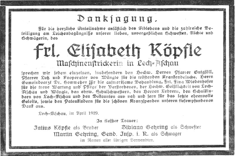 M. Frl. Elisabeth Köpfle, Maschinenstrickerin, nach neutägiger Krankheit. Die Verstorbene wurde unter zahlreicher Beteiligung der Bevölkerung zu Grabe getragen.