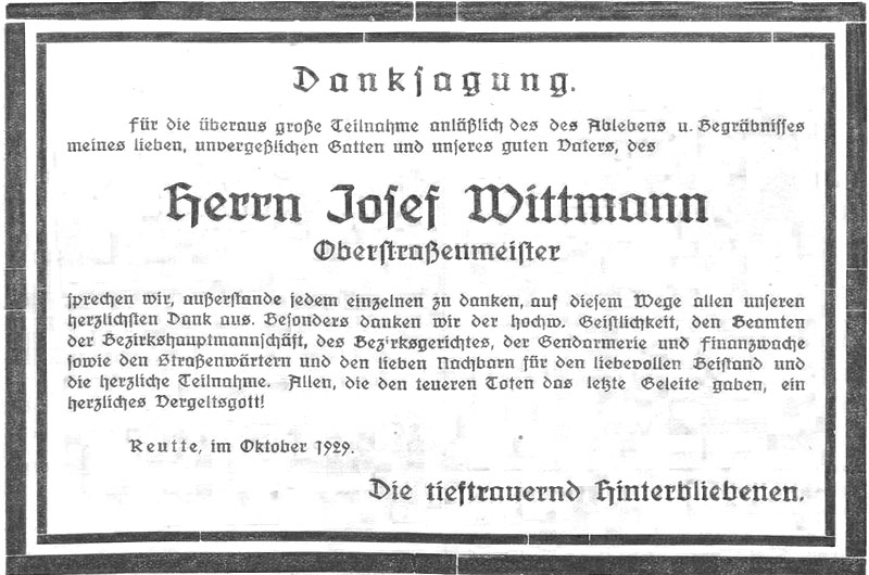 ...er versah im Bezirk Reutte seit dem Jahre 1914 den verantwortungsvollen Posten eines Straßen[meisters] und hat sich in dieser Zeit viele Verdienste um die Hebung und Verbesserung unserer Straßen erworben... [...] ...verschied [...] plötzlich und unerwartet an den Folgen eines Herzschlages...