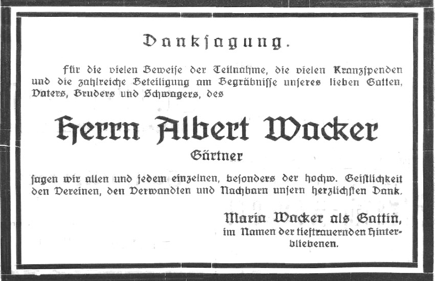 Gärtnermeister Albert Wacker † . Viel zu früh für die Familie und alle, die ihn kannten, starb am Sonntag nachmittag der Gärtner Albert Wacker nach kurzer Krankheit im Spitale Kreckelmoos. Der erst 39jährige Mann hatte vor zwei Jahren eine schwere Krankheit überstanden und sich hierauf so gut erholt, daß niemand ein schnelles Ende vermutete. Wacker war ein tüchtiger, arbeitsamer Geschäftsmann mit lauterem Charakter. An seinem gestern stattgefundenen Leichenbegängnis beteiligten sich die freiwillige Feuerwehr, die Bürgerkapelle, der Männergesangsverein und eine zahlreiche Bevölkerung. Der Männergesangsverein, dessen Mitglied der Verstorbene mehr denn 20 Jahre lang war, sang am Grabe seinem toten Sangesbruder das ergreifende Lied 'Ueber den Sternen.'