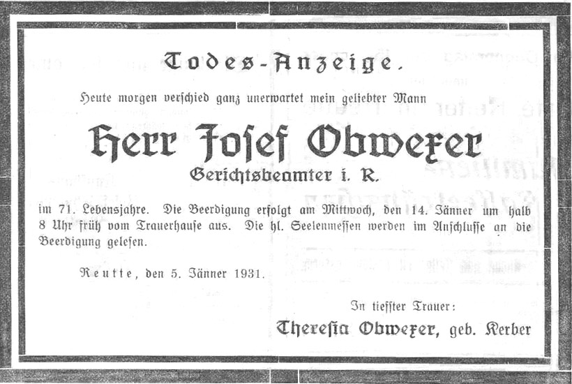 Josef Obwexer † . Still, wie er gelebt, ist ein langjähriger Mitbürger für immer von uns gegangen. Josef Obwexer, Gerichtsbeamter i. P., der sich bisher voller Gesundheit und Rüstigkeit erfreute, ist Montag früh im 71. Lebensjahre einem Herzschlage erlegen. Geboren in Layen, Südtirol, verbrachte er seine Jugend auf der heimatlichen Scholle. Nach dreijähriger Militärdienstleistung im Tiroler Kaiserjäger-Regimente stand er über 10 Jahre beim Gendarmeriekorps in Verwendung, worauf er im Jänner 1896 die Anstellung beim hiesigen Bezirksgerichte erhielt, dem er fast 26 Jahre angehörte. Mit Ende des Jahres 1921 wurde er wegen Erreichung der Altersgrenze in den dauernden Ruhestand versetzt. Obwexer hat sich durch seltenes Pflichtgefühl, Dienstbeflissenheit und Verläßlichkeit ausgezeichnet und das volle Vertrauen und die Wertschätzung seiner Vorgesetzten genossen; sein untadeliger Charakter, Bescheidenheit und angeborenes Taktgefühl sicherten ihm aber auch die Zuneigung seiner Kollegen und aller anderen die ihm näher traten. Seit dem Jahre 1899 lebte Obwexer in glücklichster Ehe mit Therese Kerber aus Breitenwang. In Würdigung der vielen schätzenswerten Eigenschaften übertrug ihm der frühere Dienstgeber seiner Frau, Direktor Schoener, anläßlich der Verlegung seines Wohnsitzes nach München im Jahre 1904 auch die Verwaltung seines hiesigen Anwesens, die Obwexer mit unermüdlichen Fleiß, Treue und Redlichkeit bis an sein Lebensende zur besten Zufriedenheit besorgt hat. Von tiefer Religiosität erfüllt, war Obwexer auch stets ein guter Christ. Er ruhe in Frieden!