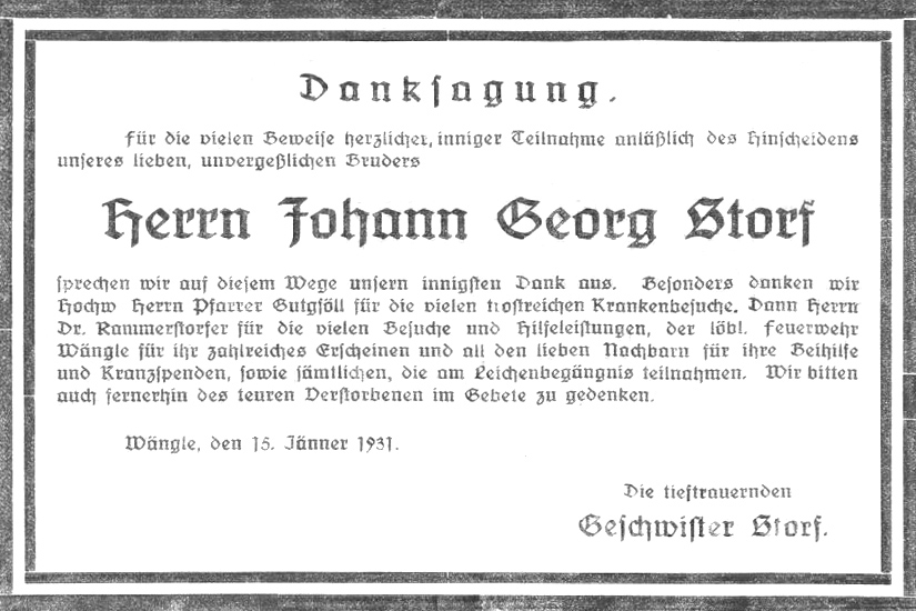 Aus: Außferner Bote vom 24. Jän. 1931 Wängle. Letzte Woche verschied nach kurzem, schwerem Leiden der allseits geachtete Jüngling Georg Storf im 61. Lebensjahre. Als 13-jähriger Knabe verlor er schon durch Absturz am Gachtpaß beim Glockentransport nach Nesselwängle seinen Vater und ging nun alljährlich in die Fremde als Maurer. Er war ein arbeitsfreudiger, friedlicher, nüchterner Mann. Von 1915 bis 1918 machte er den Weltkrieg mit. Seine vier noch lebenden Geschwister erlitten durch seinen Tod einen herben Verlust. Ein unbeachteter Fall beim Holzzug war die Ursache seines kurzen, schweren Leidens: Storf fiel auf einen Hackenstiel und zog sich innere Verletzungen zu, die seinen Tod herbeiführten. Die große Teilnahme an seinem Begräbnis, besonders das geschlossene Auftreten der Feuerwehr mit Fahne, möge ein Trost sein für die trauernden Geschwister!