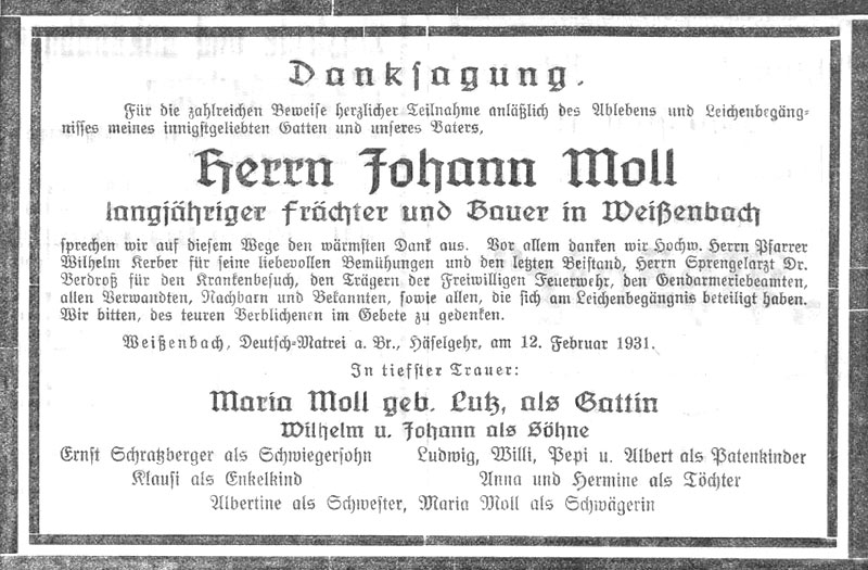 Weißenbach. Im Alter von 68 Jahren verschied unerwartet schnell am 10. ds. um 5 Uhr abends der allbekannte und beliebte Frächter und Bauer Johann Moll, geboren in Häselgehr, nach kurzem, schwerem Leiden, versehen mit den hl. Sterbsakramenten. Der Verstorbene war jedem ein aufrichtiger, gutmeinender Freund. Er gehörte auch der Freiw. Feuerwehr als langjähriges Mitglied an. Sein schnelles Hinscheiden wird allseits bedauert. Er hinterläßt seine Gattin und 4 Erwachsene Kinder.