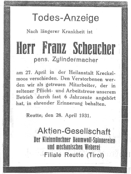 Franz Scheucher † . Nach längerer Krankheit ist Herr Franz Scheucher, ehemaliger Zylindermacher der Baumwoll-Spinnerei und Weberei im 71. Lebensjahre am 27. April in der Heilanstalt Kreckelmoos verschieden. Der Verstorbene, der dem Betriebe durch 57 Jahre in pflicht- und arbeitstreuer Weise angehörte, hat durch Jahrzehnte hindurch die Arbeit des Zylindermachers versehen. Wenn 70 Jahre schon ein ehrend hohes Alter bedeuten, um wieviel Achtung mehr verdient eine fast 6 Jahrzehnte lange Berufstätigkeit! Obwohl schon kränklich, hat Franz Scheucher an der Jubiläumsfeier im Jänner vorigen Jahres noch mit regem Anteil als der älteste der Arbeiter-Jubilare teilgenommen. Der Verstorbene hinterläßt seine Frau einen Sohn und eine Tochter. Das Ansehen, das dem bescheidenen und arbeitsamen Mann von allen Seiten bis über den Tod hinaus zukommt, wird den Hinterbliebenen einigen Trost zu bringen vermögen.