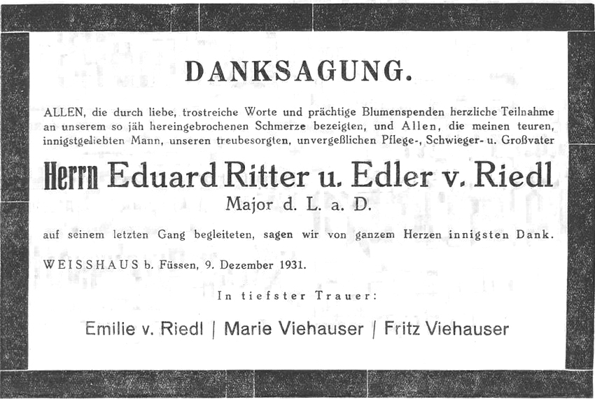 Weißhaus. Wie ein Lauffeuer verbreitete sich am Samstag gegen Mittag die Kunde: Der Besitzer des Gasthofs Weißhaus ist plötzlich gestorben. Herr Eduard von Riedl hat ein Alter von 63 Jahren erreicht. Mit ihm ist ein Mann von echtem Schrot und Korn, ein aufrechter, ehrlicher und biederer Bayer von uns gegangen. Er wurde seinerzeit in München als der Sohn einer hochangesehenen Goldschmiedefamilie geboren, erlernte die Goldschmiedekunst und leitete sodann mehrere Jahre das elterliche Geschäft. Aus Gesundheitsrücksichten mußte er dann seinen Beruf aufgeben. Herr von Riedl war ein großer Freund der ehemaligen kgl. bayr. Armee. Mit Leib und Seele war er seiner militärischen Laufbahn ergeben. Bei Kriegsausbruch rückte er sofort ein und war zuerst als Rittmeister im Bekleidungsamt tätig, später als Major beim Gefangenenlager Lechfeld. Ueberall wurden seine militärischen Eigenschaften anerkannt. Seinen Soldaten war er stets ein treuer Berater, ein Vorgesetzter, der das Vertrauen seiner Untergebenen in hohem Maße besaß. Schwer lasteten und drückten auf ihn die Umsturzverhältnisse von 1918, die er nie ganz überwand. Er, der in Königszeiten aufgewachsen war, konnte sich nie so recht in die Errungenschaften der Revolution fügen. 1920 heiratete er nach Weißhaus. Seiner Familie war er stets ein treubesorgter, liebender Gatte und