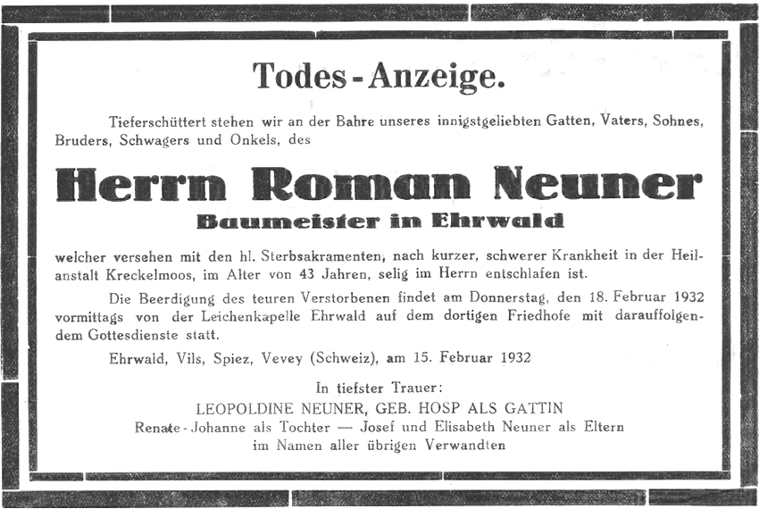 Baumeister Roman Neuner, Ehrwald † . Mitten aus seinem schaffensreichen Leben entriß des rauhen Todes Hand einen Mann, dessen bisheriges Wirken in seiner Berufstätigkeit große Hoffnungen erweckt hatte. 43 Jahre alt, verschied in der Heilanstalt Kreckelmoos am 15. Februar Herr Baumeister Roman Neuner an den Folgen einer schweren Lungen- und Rippfellkrankheit. Nur kurze Zeit war er an das Sterbelager gefesselt. Es hätte auch niemand gedacht, daß